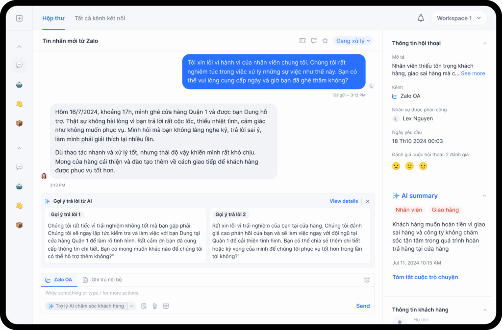 - Chăm sóc khách hàng: Agent tiếp nhận – phân tích – phản hồi các khiếu nại, câu hỏi từ khách hàng đa kênh.